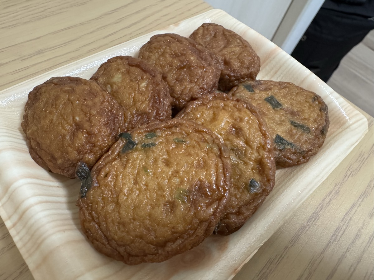 吉松駅前温泉湯の宿ゆうすいでのエーコープ吉松店調達の部屋呑みのアテ3品め、串木野たからや蒲鉾さんのごぼう天にら天つけあげセット!