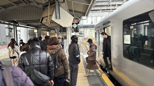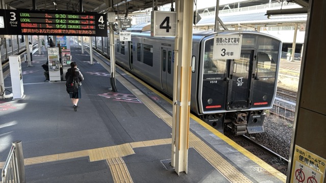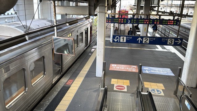 福間駅に4分遅延でダイヤ設定がおかしいだろJR九州!( *`ω´) でエスカレーター経由して1番線にまわって特急ソニック47号大分行き自由席に