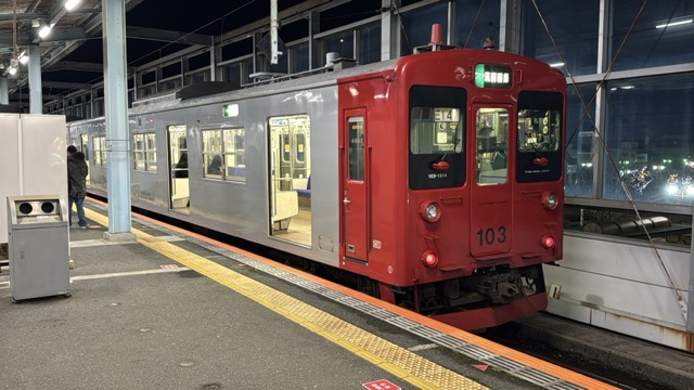 和多田駅から4時47分の定時発、普通筑肥線筑前前原行きの103系国鉄塗装で、九州島内最長O型きっぷの旅開始