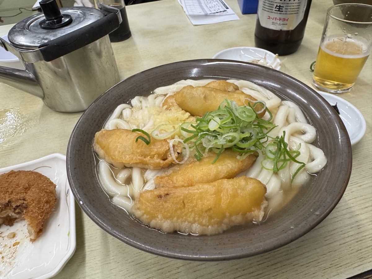 牧のうどん和多田店で大瓶ビール2本に軟めんだし吸い膨張で完全腹パンのごちそうさま!