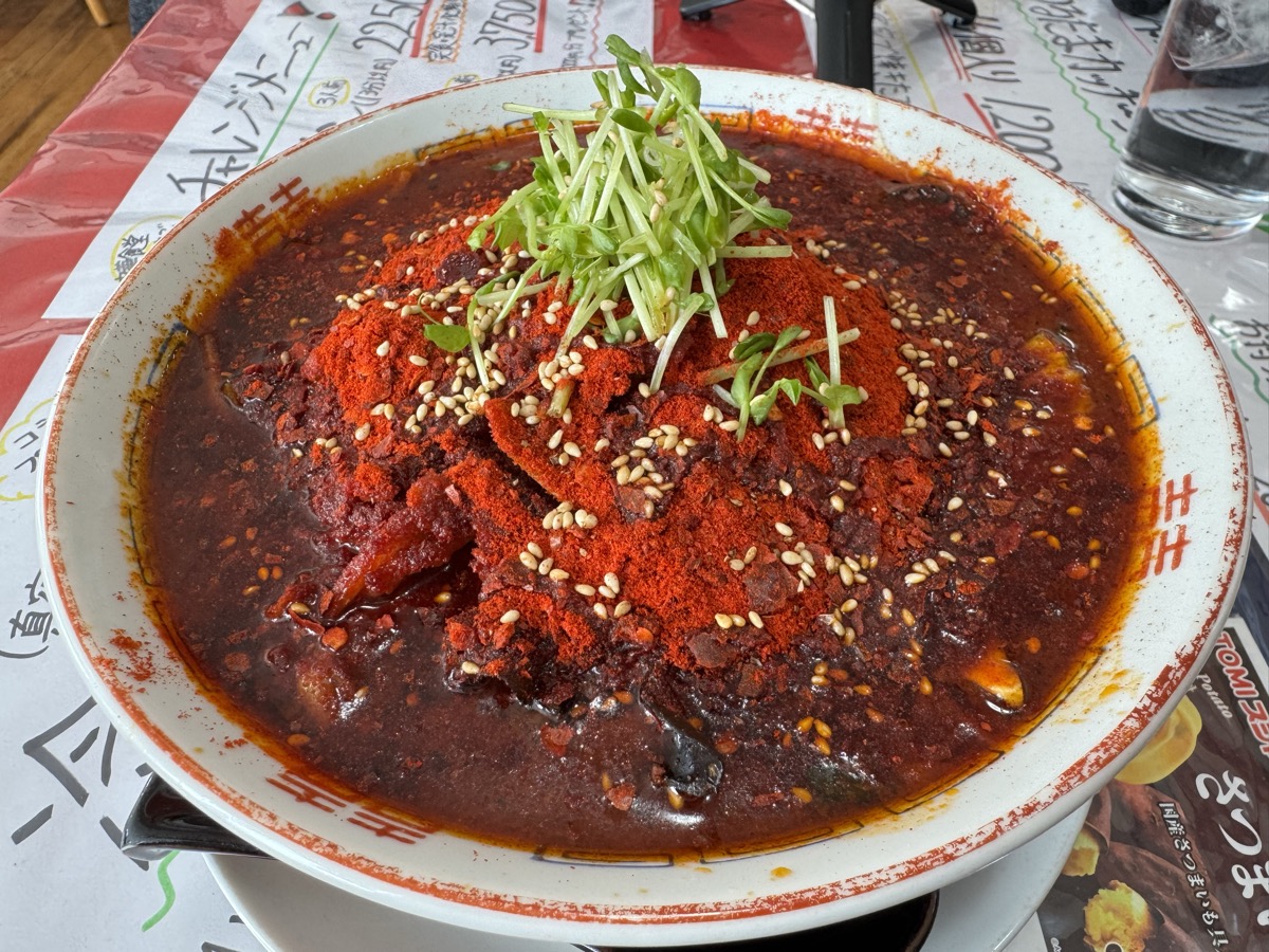 あいかわらずしっかり辛く、歯切れよくしかしもっちりもある麺に甘味塩味のバランス良いスープ+唐辛子がめっさ(・∀・)アウ!! スープは唐辛子から甘酸苦旨味ぜんぶ出て絶品\(^ω^)/ CoCo壱20辛レベルの旨辛ですがカプサイシン総量はCoCo壱より多いゾ(^_?)?☆ 13分強完食完飲!