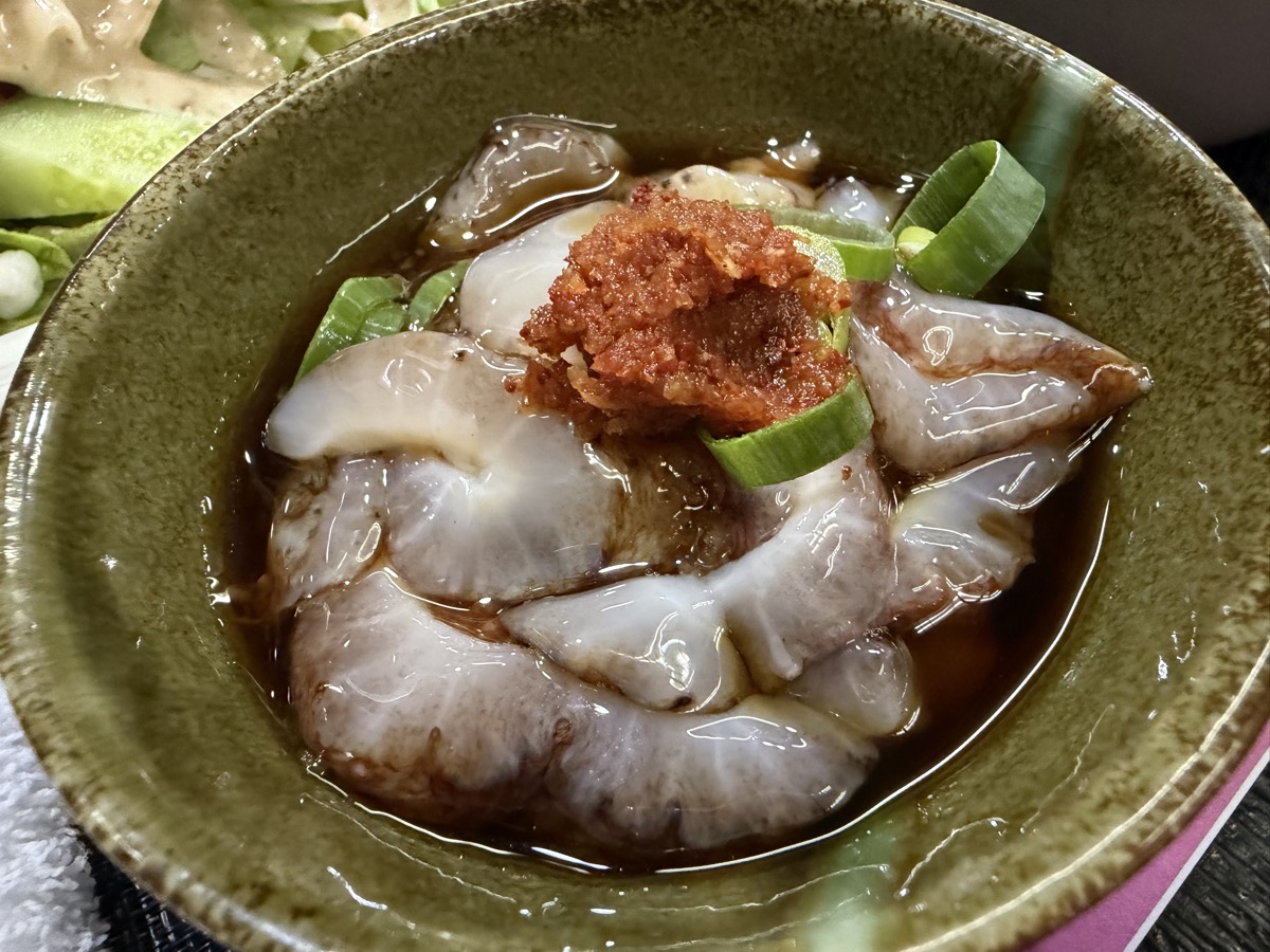どちらもめちゃめちゃ(・∀・)ボリューミィー!! なまこ酢は甘くて酸っぱくてしょっぱいタレと大根おろしでばくばく食べられますがそれでも減りません!ヽ(´▽`)/ 黒豚サラダも冷たい脂含めて食べやすいんである(((o(*゚▽゚*)o)))